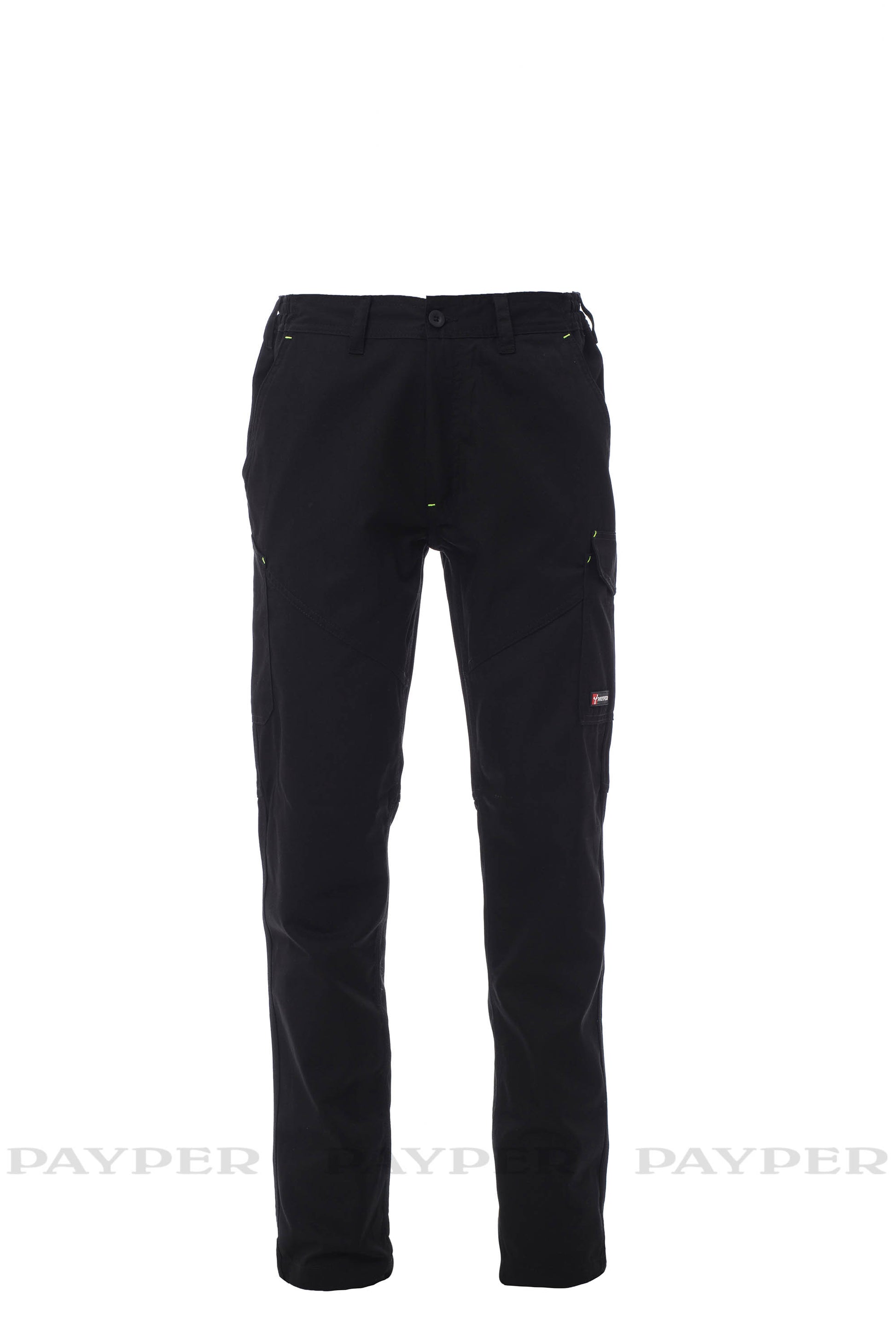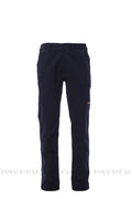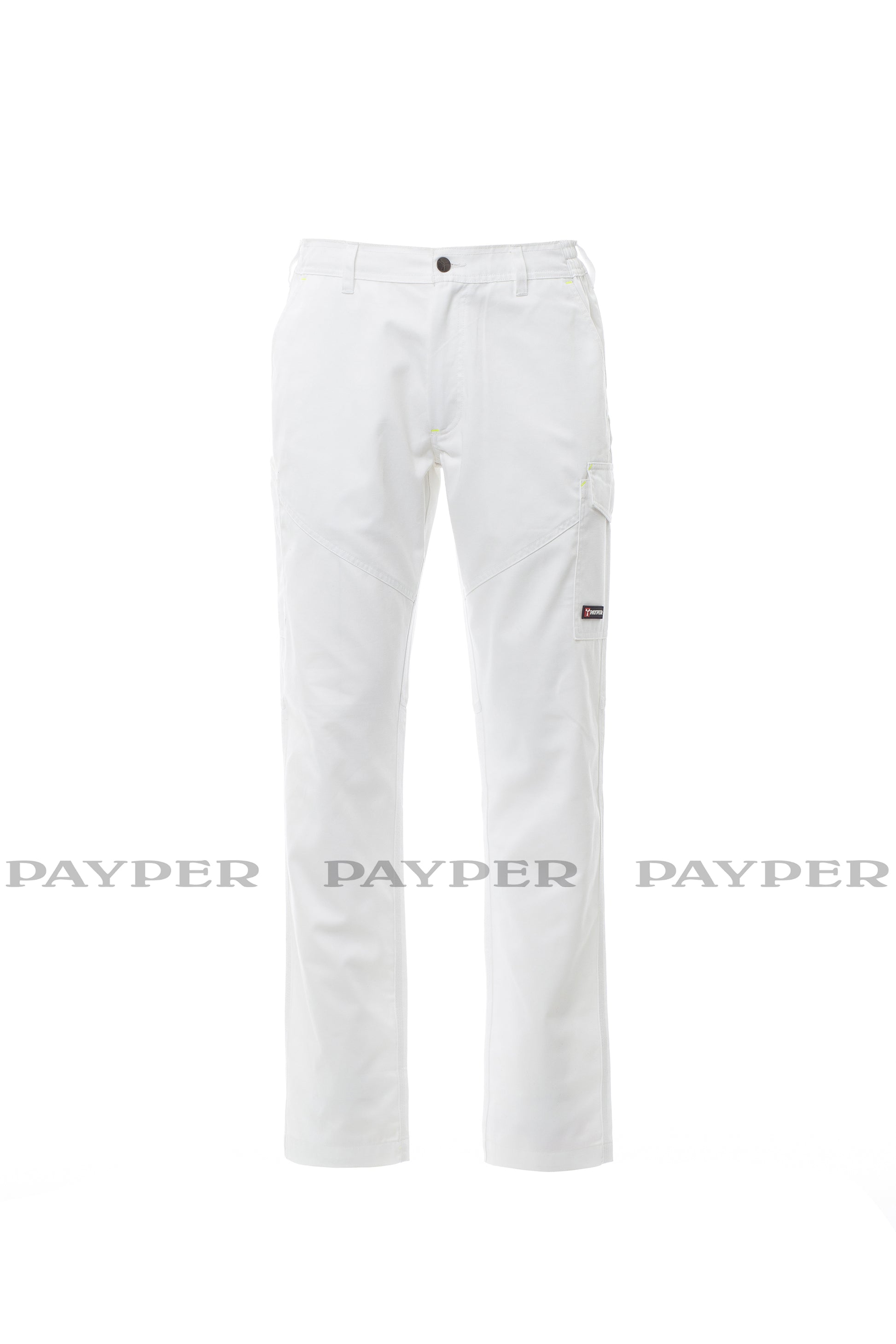 Ganzjährig tragbare Unisex-Hose, seitlich dehnbarer Bund und Gürtelschlaufen, Hosenschlitz mit Reißverschluss und Knopf aus Kunststoff, 2 klassisch geschnittene Vordertaschen, 1 Seitentasche mit LOCK SYSTEM, 1 Zollstocktasche, 1 offene Gesäßtasche und 1 mit Patte und Klettverschluss, Nähte Ton-in-Ton, Reflexstreifen auf der Gesäßtasche, Dreifachnähte. Nietknopf bei Ausführung in Weiß.